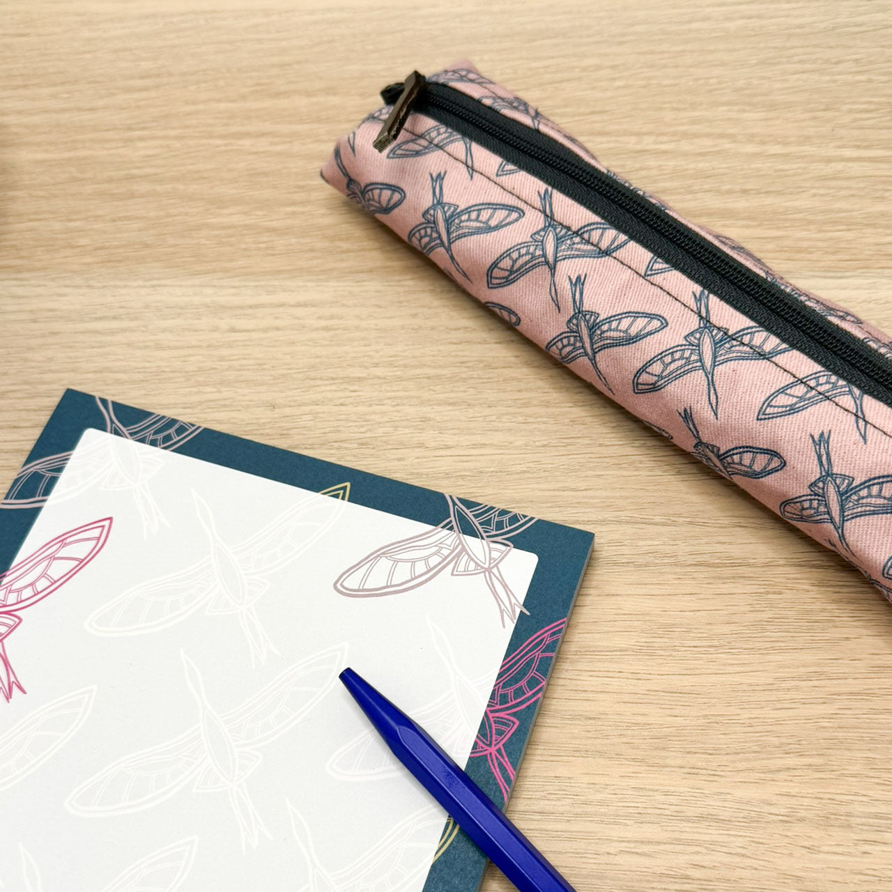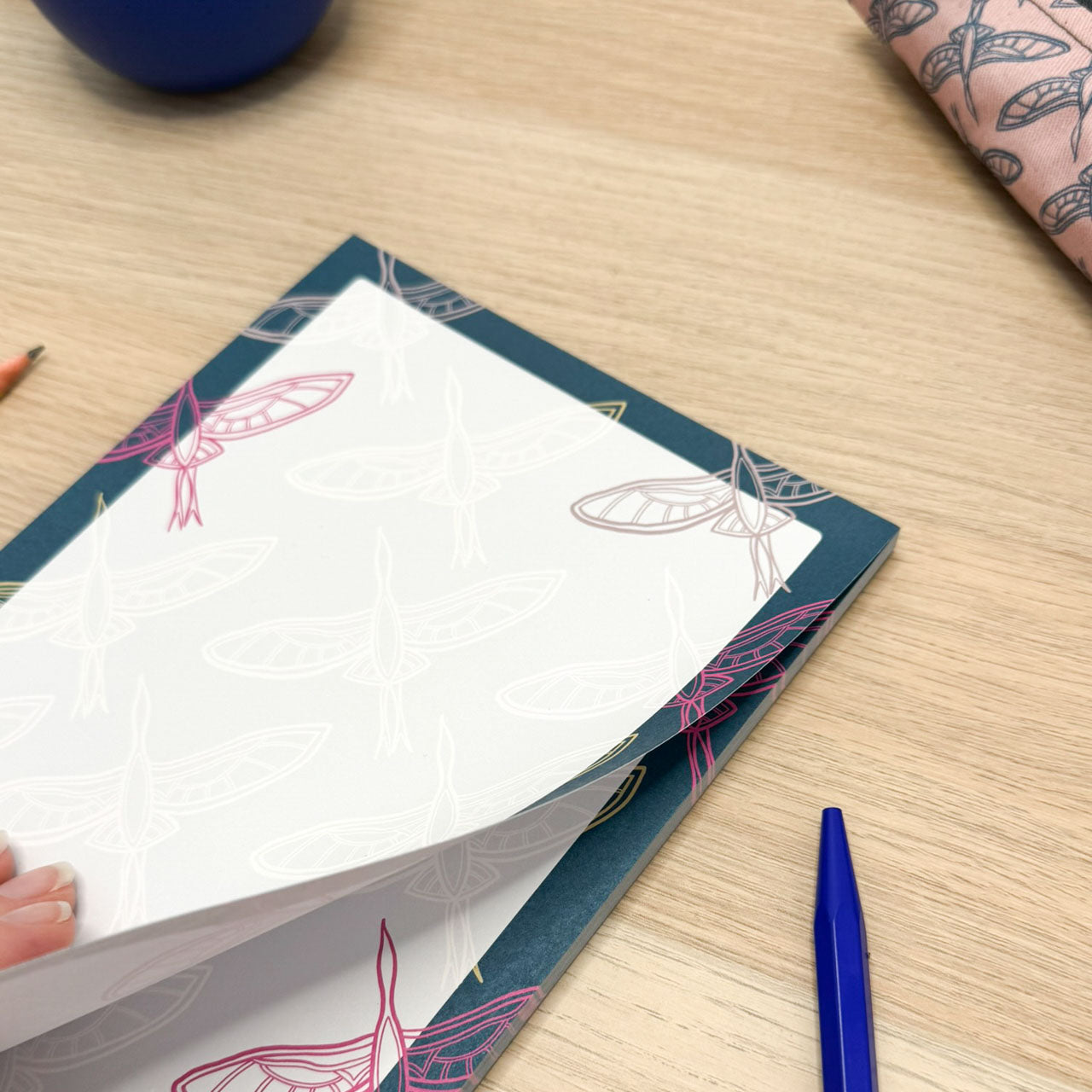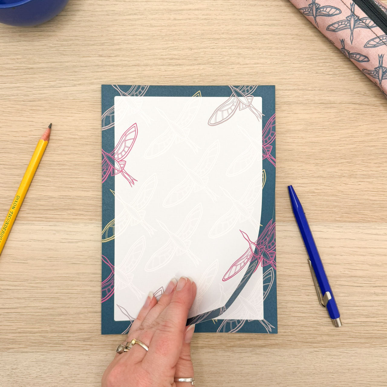 The pattern was originally inspired by some research I was doing into migrating birds (my daughter had asked a question!) and images I saw of the flocks flying in formation. Using my original hand-drawn sketch, drawn in a style inspired by wire-jewellery, these motifs were refined digitally before turning them into a repeat pattern and then their colour and place adapted to fit around the writing panel in the notepad.