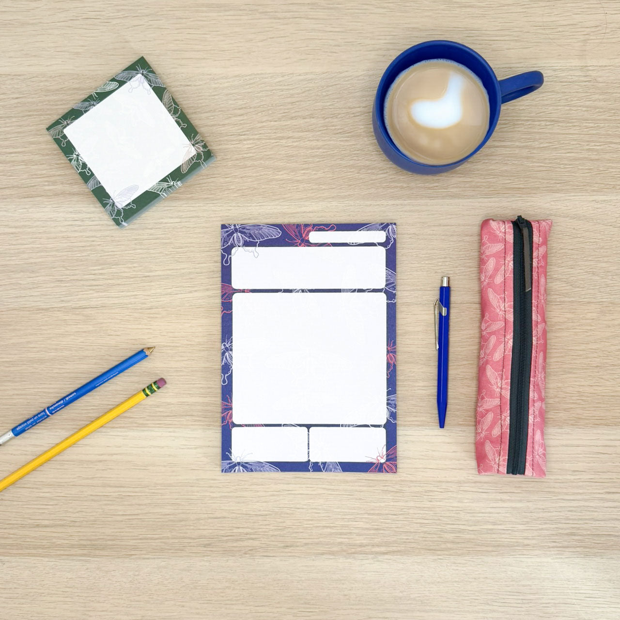 There's 100 pages of recycled paper per pad with motifs from my Moonlit Moths pattern decorating the edges but not taking over the writing panel. And the writing panel itself is semi-opaque which means you can slightly see the pattern underneath but most importantly you can also see your notes (which is obviously key!).